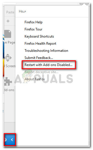 - Open Firefox, click on the menu icon (top-right corner). Then, click on the Help icon (question mark icon) and then click on Restart with Add-ons Disabled.