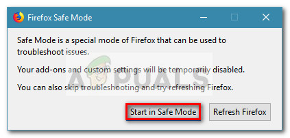 Note: You can also start Firefox directly in Safe Mode by holding the Shift key while double-clicking on Firefox. - At the newly appeared prompt, click the Restart button, then click on Start in Safe Mode and wait until Firefox restarts in safe mode.
