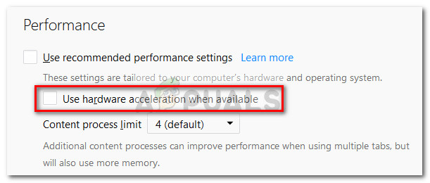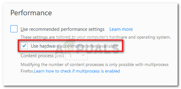 Some users that were constantly experiencing periods of unresponsiveness in Firefox have managed to resolve the issue by enabling the use of hardware acceleration in the Performance tab. Supposedly, the periods of unresponsiveness happen because certain systems don’t have the resources to process the graphical elements that the user requires without using the help of hardware acceleration.