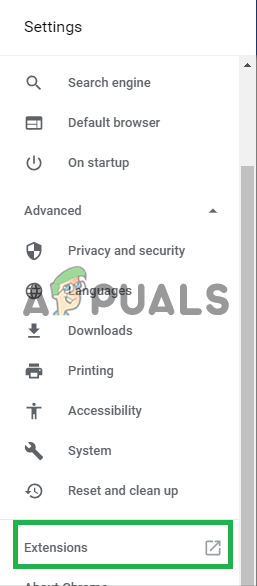 Clicking on “Extensions” after scrolling down. - This will open the list of extensions in a new tab, now make sure to disable all of them by clicking on the “Disable” button.