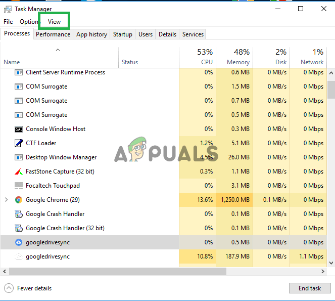 - Click on the “Processes” tab and then click on the “View” option on the top.