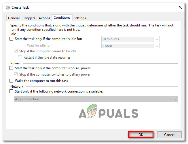 Configuring the Hamachi Startup task (Actions) - Next, go over to the Conditions tab and uncheck everything there. Now, hit Ok to save the changes.