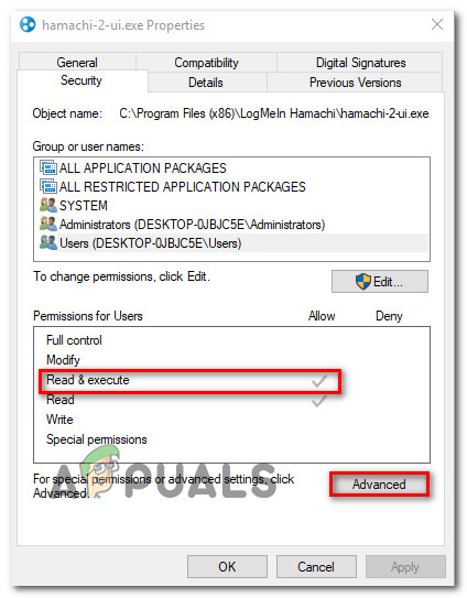 - Then, go to the Security tab and select the Users group under Group or user names. Then ensure that the Read & Execute permissions are allowed. If they aren’t, click the Advanced button and modify the permissions accordingly.