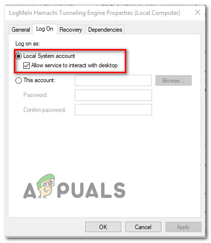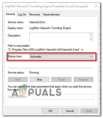Some affected users have reported that they managed to resolve the issue by setting the startup type of LogMeIn Hamachi Tunneling Engine service to Automatic and allowing the service to log in as the local system account. Upon a restart, most affected users have reported that the issue was resolved.