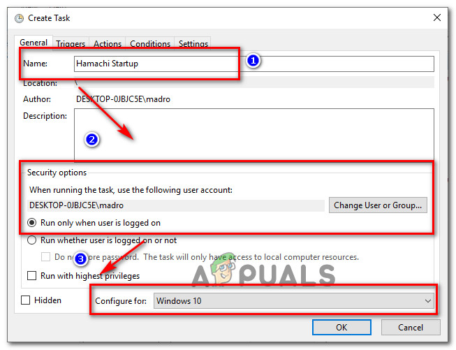 Creating a new task with Task Scheduler - From the Create Task window, go to the General tab and set a name for your task. Use whatever name you want. Then, move over to Security Options, make sure that your user account is selected and check the toggle associated with Run only when the user is logged on. Finally, use the drop-down menu associated with Configure for and select Windows 10 from the list.