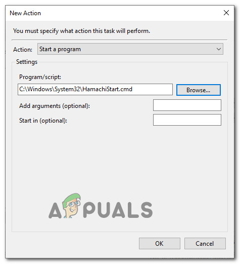 Configuring the Hamachi Startup Task (Triggers) - Next, move over to the Actions tab and click on the New… button. From the New Action screen, set the Action to Start a program (using the drop-down menu) and hit the Browse button associated with Program/script (under Settings). Then, browse to C:\Windows\System32, select HamachiStart.cmd and press Open. Finally, hit Ok to close the window.