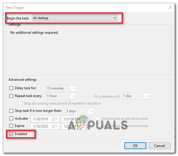 Configuring the Hamachi Startup task (General) - Next, move over to the Triggers tab and click on New… From the New trigger screen, set the drop-down menu associated with Begin the task to At Startup, then make sure the Enabled box at the bottom of the screen is checked. Finally, hit Ok to save the changes.