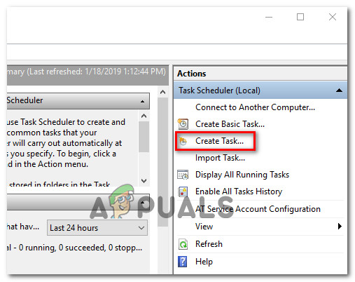 Running the Task Scheduler utility from the Run dialog box - Inside the Task Scheduler, click on Create task from the right-hand side menu.