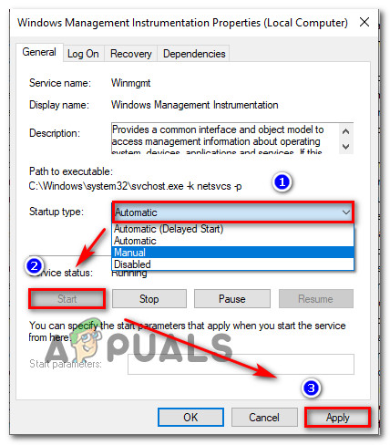 Accessing the Properties screen of the WMI service - Inside the Properties screen of the WMI service, go to the general tab and make sure that the Startup type is set to Automatic. If it isn’t, change it using the drop-down menu. Once the startup type has been modified, start the service (using the Start button) and click Apply to save the changes.