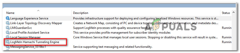 Run dialog: services.msc - Inside the Services screen, scroll down through the list of services and locate the LogMeIn Hamachi Tunneling Engine service. Once you see it, double-click on it.|