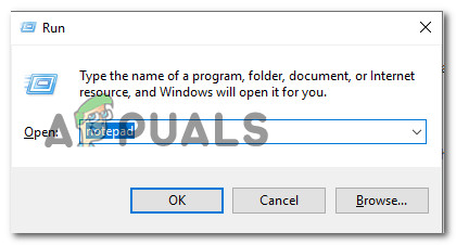 - Press Windows key + R to open up a Run dialog box. Then type “notepad” and press Ctrl + Shift + Enter to open a new notepad window as Administrator. When prompted by the UAC (User Account Control), choose Yes to grant administrative privileges.
