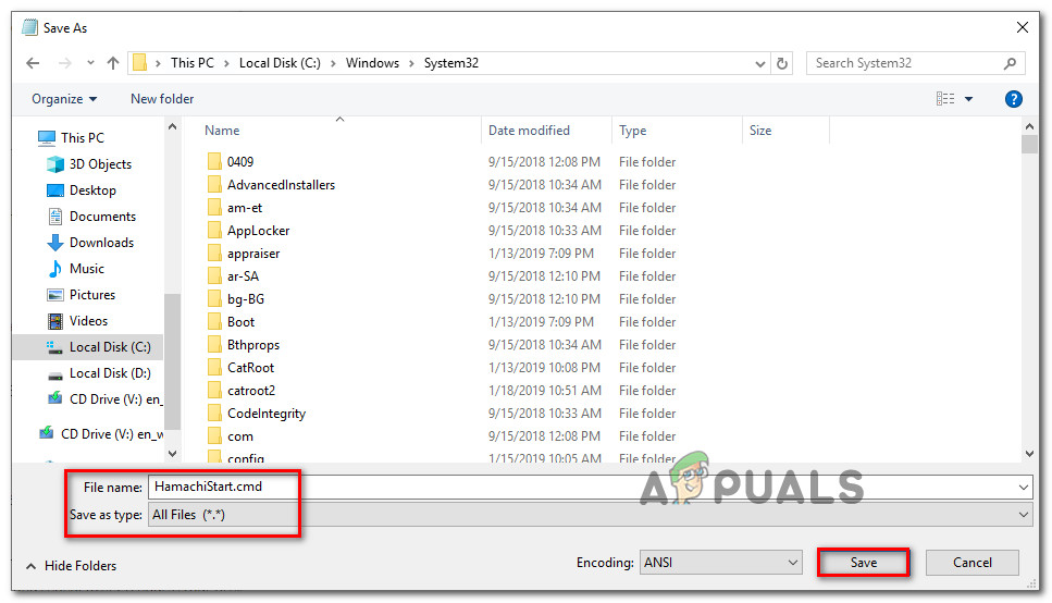 - Once the code is configured, go to File > Save As. Then, in the Save As window, set the name of the file as HamachiStart.cmd and change the Save as type to All Files. Then, navigate to C:\Windows\System32 and hit Save to store the newly created CMD file in the System 32 folder.