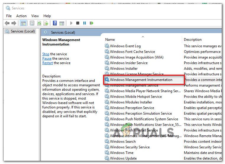 Run dialog: services.msc - Inside the Services screen, locate the Windows Management Instrumentation service from the right-hand pane. Once you see the WMI service, double-click on it to open the Properties screen.