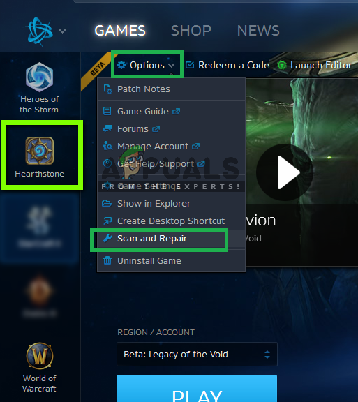- Open the Blizzard application. Now click on the Games tab and select Hearthstone from the left navigation pane. Now click Options and select Scan and Repair.