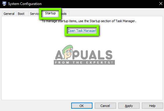 - Now navigate to the Startup tab and click the option of “Open Task Manager”. You will be redirected to the task manager where all the applications/services which run when your computer starts will be listed.