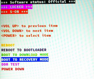 3. Continue pressing the Volume Down button until you see a black screen with red and blue text.
