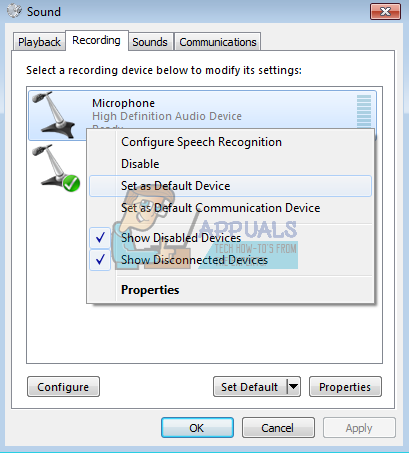 - Go to the recording tab. Right click anywhere on the list and make sure that the “Show Disabled Devices” and the “Show Disconnected Devices” options are checked.