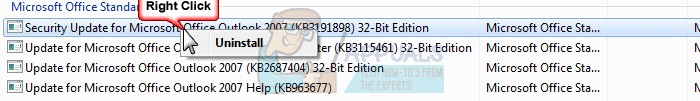 - Now right click on the Security update for Office Outlook and select Uninstall. This will uninstall the security update from your computer.