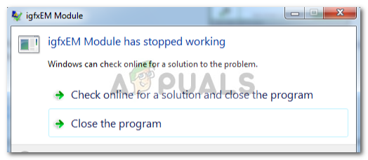 The ‘igfxEM module has stopped working’ error is usually caused if you have an outdated Intel Graphics driver or an unstable one. It is a component of the Intel® Common User Interface and is not, in any way, related to the core of Windows. It is mostly used in Laptops and works as a Display Resolution persistent. However, some malware uses this process as a disguise so be thoughtful of it. Please refer to this article if you are intrigued to find more information relating igfxEM.exe file.