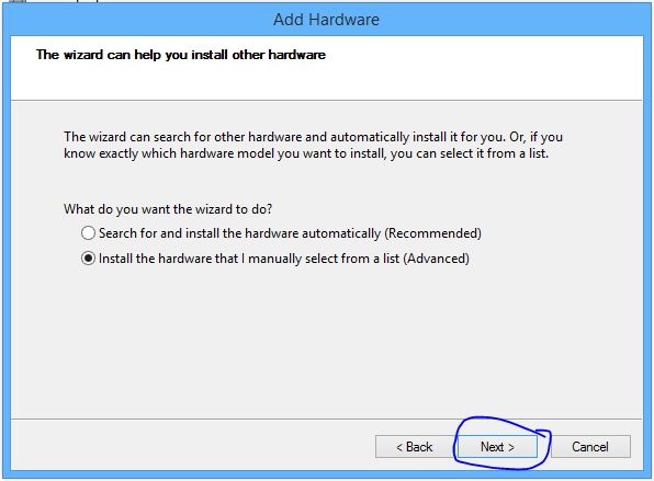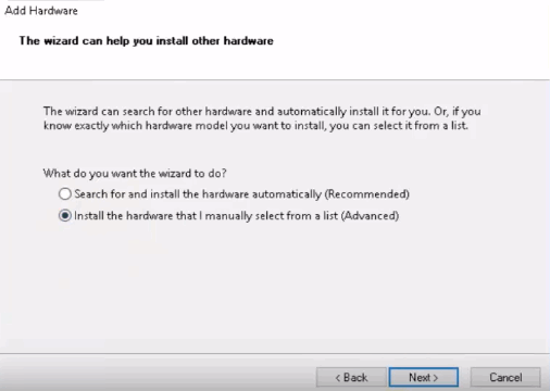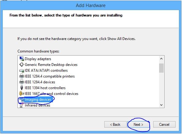- Click Next, select “Install the hardware that I manually select from the list“, and click Next. Choose Imaging Devices, then click Next again.