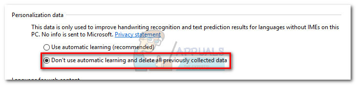 - Next, scroll down to Personalization data and choose Don’t use automatic learning and delete all previously collected data.
