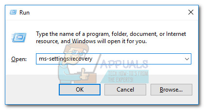 To reset Windows 10, press Windows key + R to open a Run window and type “ms-settings:recovery“. Hit Enter to access the Recovery section of Windows 10 Settings.