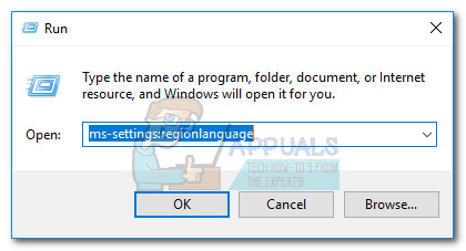 - Press Windows key + R to open a Run window and type “ms-settings:regionlanguage“. Hit Enter to access the Language section of the Settings app.