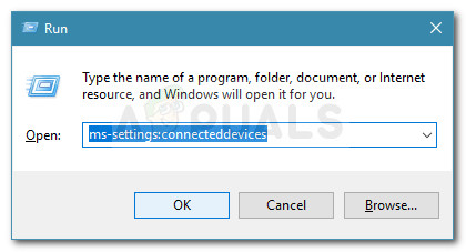 - With the device disconnected, press Windows key + R to open up a Run box. Next, type or paste “ms-settings:connecteddevices” and hit Enter to open the Devices tab of the Settings app.