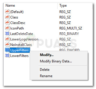 - With the correct Class selected from the left pane, move over to the right pane, right-click on UpperFilters and choose Delete. Then, repeat the same procedure with the LowerFilters key.