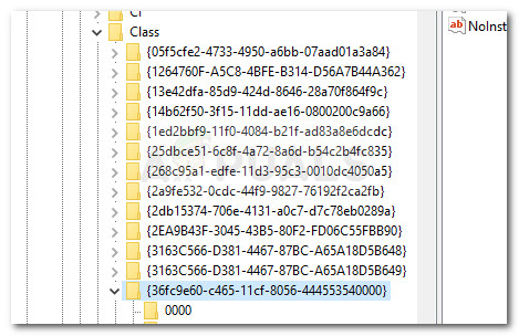 - Double-click on the 36FC9E60-C465-11CF-8056-444553540000 (USB host controllers and hubs) inside the Class subkey .
