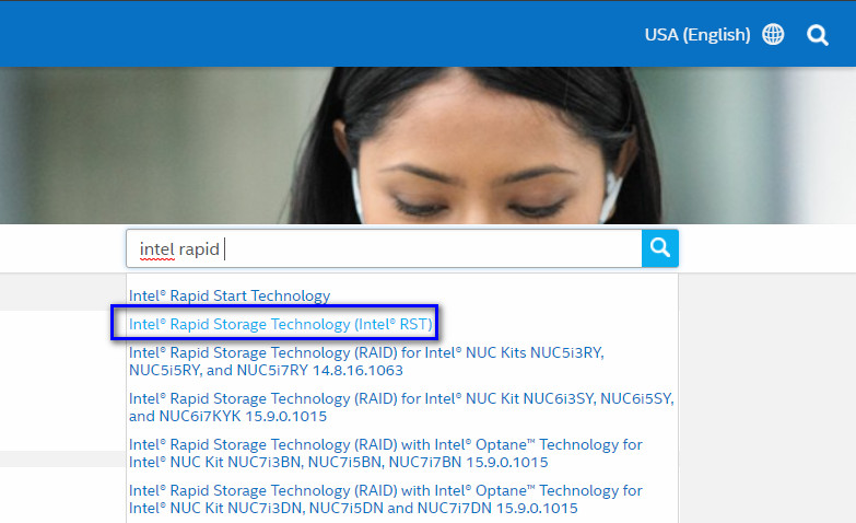 - Then navigate to the Official Intel Downloads Type “Intel rapid” in the dialogue box and from the results, select “Intel® Rapid Storage Technology (Intel®RST)”.