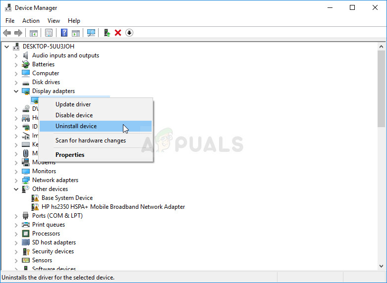 - Since it’s the graphics card driver we want to update on your computer, expand the Display adapters category, right click on your graphics card and select the Uninstall Device option.
