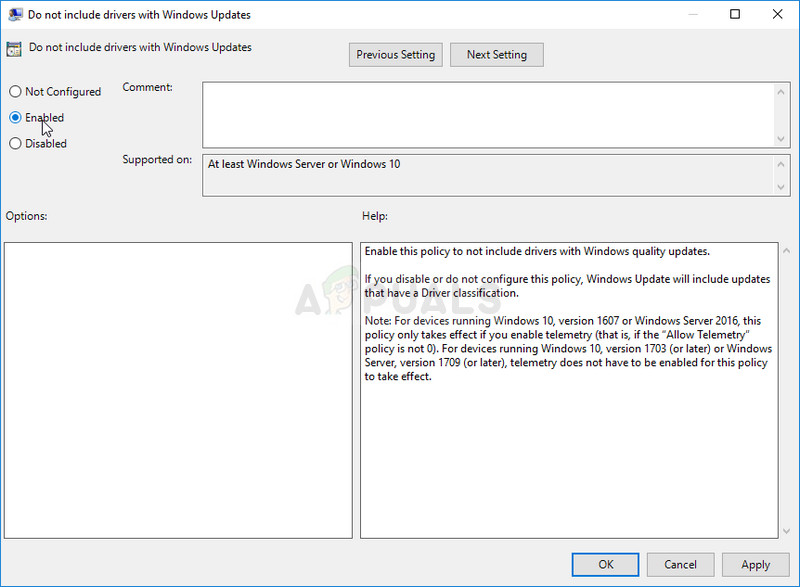 - Double click on the “Do not include drivers with Windows Updates” policy option, check the radio button next to the “Enabled” option, and apply the changes you have made before exiting. The changes won’t be applied until you restart.