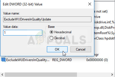 - Set the name of the key to ExcludeWUDriversInQualityUpdate. Right-click on it once more and choose the Modify option from the context menu. Under the value data, set it to 1 and change the Base option to Hexadecimal. Click on the OK button, restart the computer and check to see if the BSOD persists.