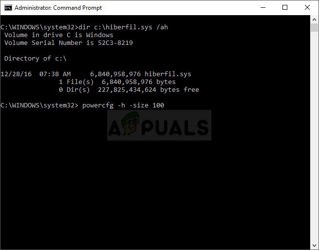 - Copy and paste the command below. Click Enter in order to execute it and wait for the message saying to which size the hibernation file is set to.