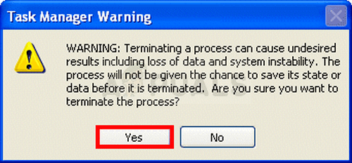 - Click Yes to the message which is going to be displayed: “WARNING: Terminating a process can cause undesired results including loss of data and system instability….” or any other warning popup, depending on the version of Windows you have installed.