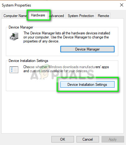 - Navigate to the Hardware tab and click on “Device Installation Settings”.