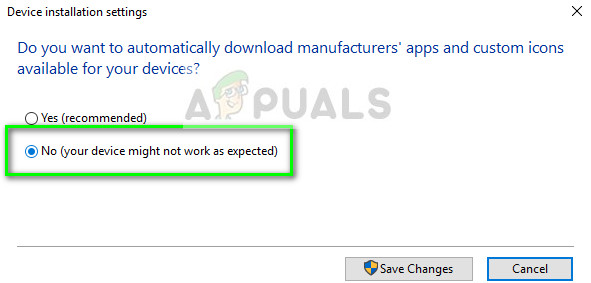- Select the option of “No (your device might not work as expected)”. Press Save changes and exit. This will disable the Windows update from updating your graphics drivers automatically.
