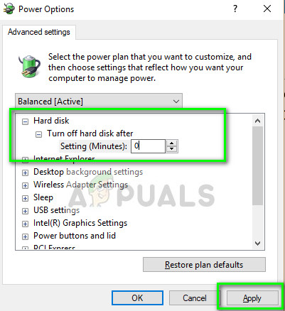 Another solution which worked for some people was setting the hard drive sleep timer to 0. After a certain idle time, the computer sets the hard drive to a stop state. This saves power and helps minimize the energy user. However, in some cases, the hard drive fails to start operation after the sleep phase and the BSOD occurs. We can try to disable this feature and see if this does us any good.