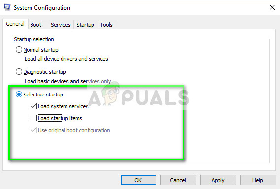 - Select the General tab and check the option Selective startup. Also only check Load system services.