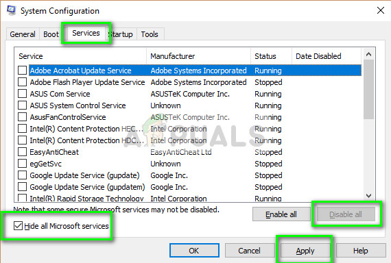 - Now select the tab services and check the option Hide all Microsoft services. Click on Disable all to disable all the other services and click Apply.