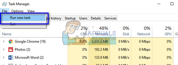 - Now click on File option present at the top left side of the window and select “Run new task” from the list of options available.