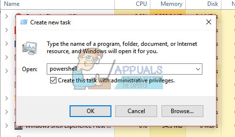 - Now type “PowerShell” in the dialogue box and check the option underneath which states “Create this task with administrative privileges”.