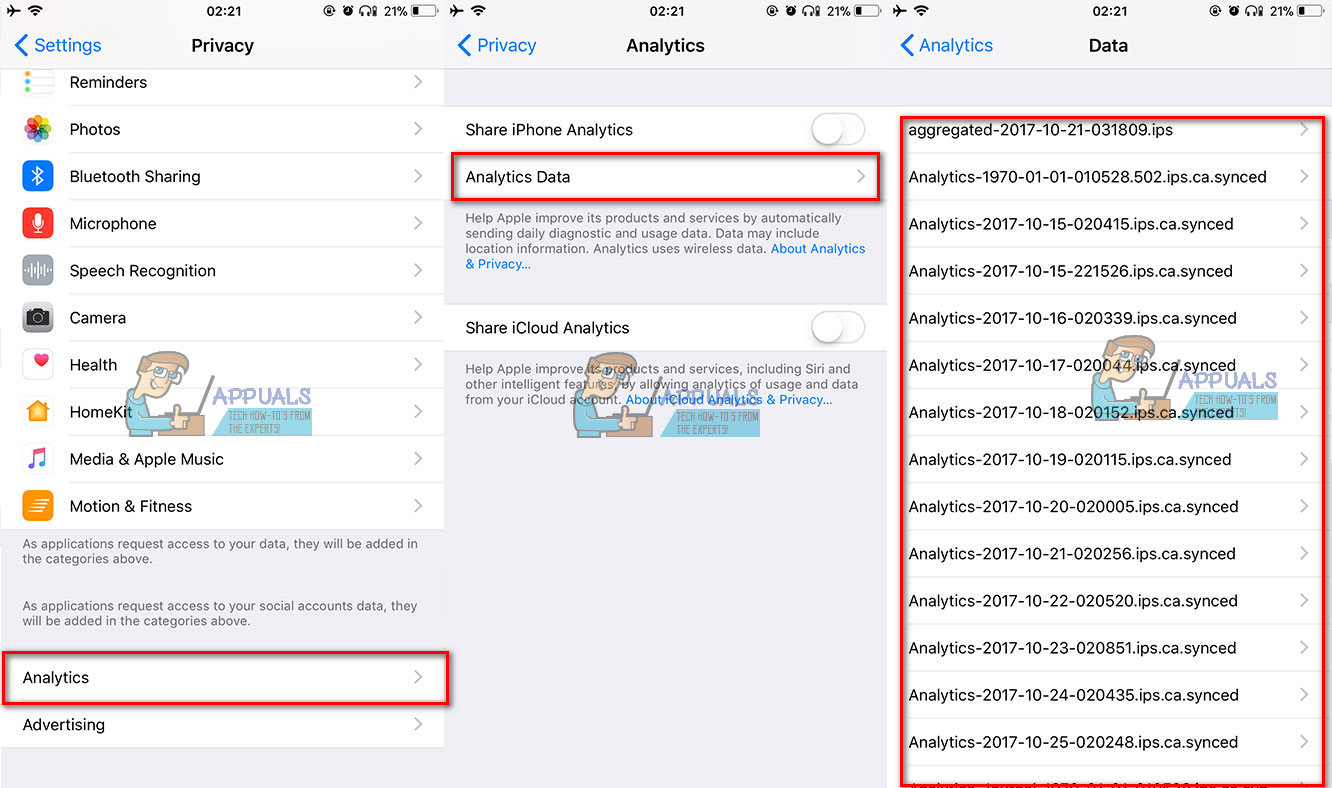 - Scroll down and tap on Analytics, then open Analytics Data. (For iOS 10 or older, tap on Diagnostic & Usage and then open Diagnostic)