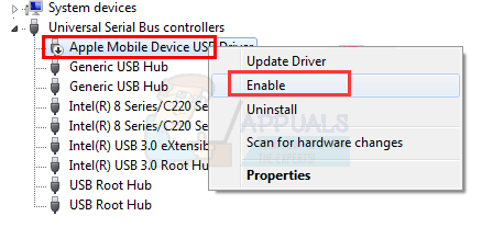 - Right click Apple Mobile Device USB Driver and select Enable. If you see a Disable option then that means this device is already enabled. In this case, click Disable and then select Enable This will restart the device.