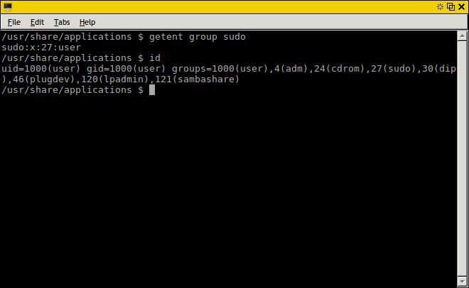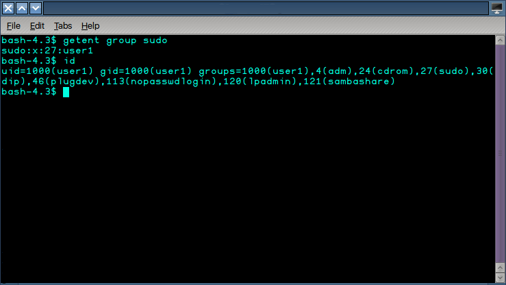 You may wish to check that the changes stuck. Try running getent group sudo followed by id, as we had done before, to make sure that everything is working correctly.
