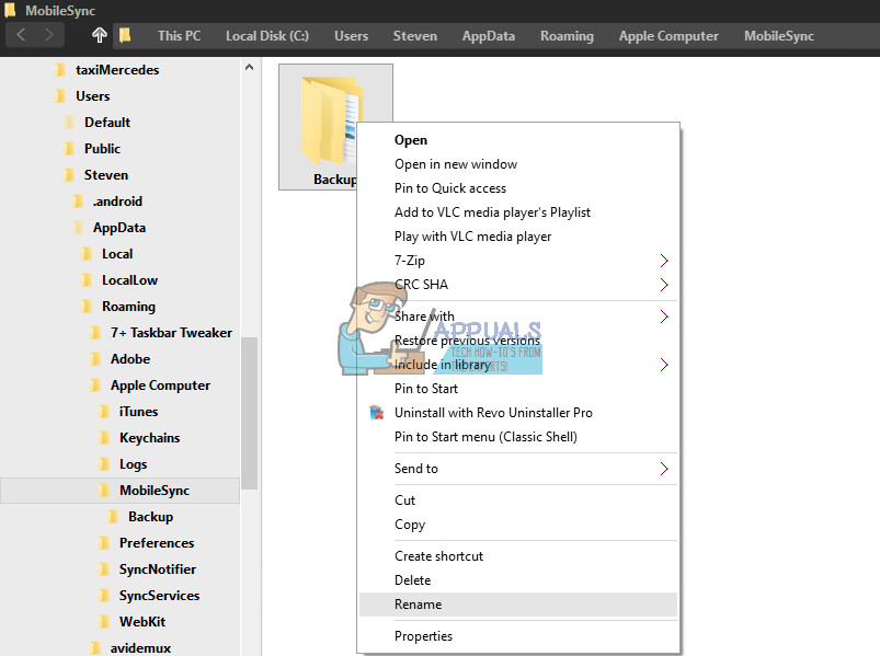 - On Windows 7 or below, click on Start, choose Run, type “%appdata%” (without the quotes) and press Enter. Now, navigate to Apple Computers > MobileSync > Backup.