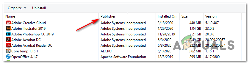 Type appwiz.cpl and Press Enter to Open Installed Programs List - Once you’re inside the Programs and Features screen, click on the Publisher column at the top to filter the list of installed programs via their publisher. This will make it easier to uninstall the main iTunes application along with every supporting software.