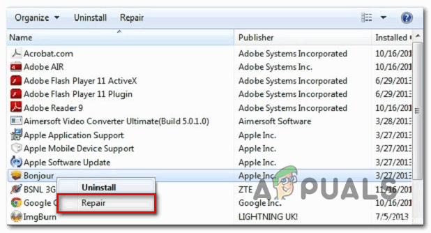 - Corrupt Bonjour app – There are more sever circumstances that might prevent the Bonjour service from assisting the main iTunes application. For example, a quarantined item or a bat installation might render this service ineffective, in which case, you will need to force a repair via the Programs and Features screen.