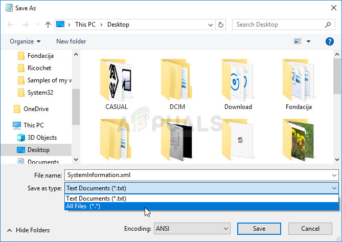 - Under the Save as type option, switch it to All files and set the File name option to “SystemInformation.xml” without the quotation marks.